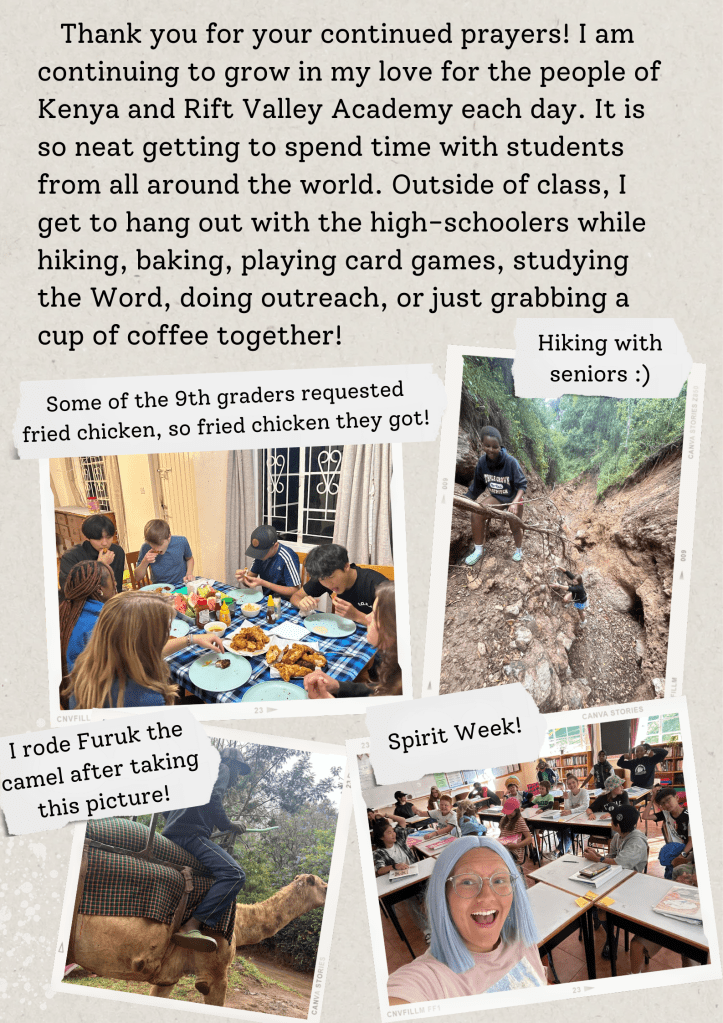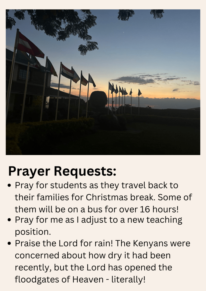 praying for you as you do the Lord’S work there in Kenya. Also for your students. Loved Listening to you and your dad this morning on my way to take my great grands to school and back home. You are a blessing to many. Enjoy being home for christmas with family and friends. Prayers for Safe travels back to Kenya. πŸ©·πŸ™πŸ™πŸ™. I should mention i live in Pontotoc Ms. Listen to AFR all the time.